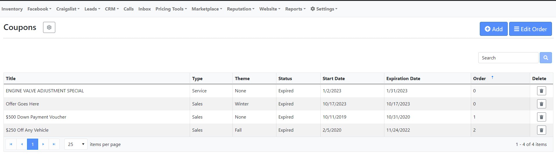 The Coupons tab allows you to add custom coupons to your website for your customers to utilize, such as a free oil change or trade in bonus.