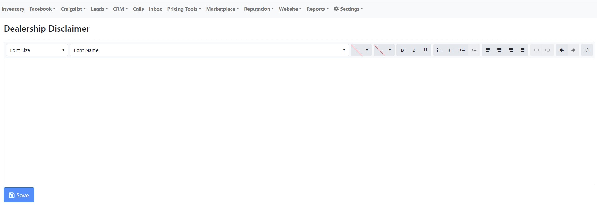 The Dealership disclaimer page allows you to add a custom dealership disclaimer that will be added to every vehicle on your website.