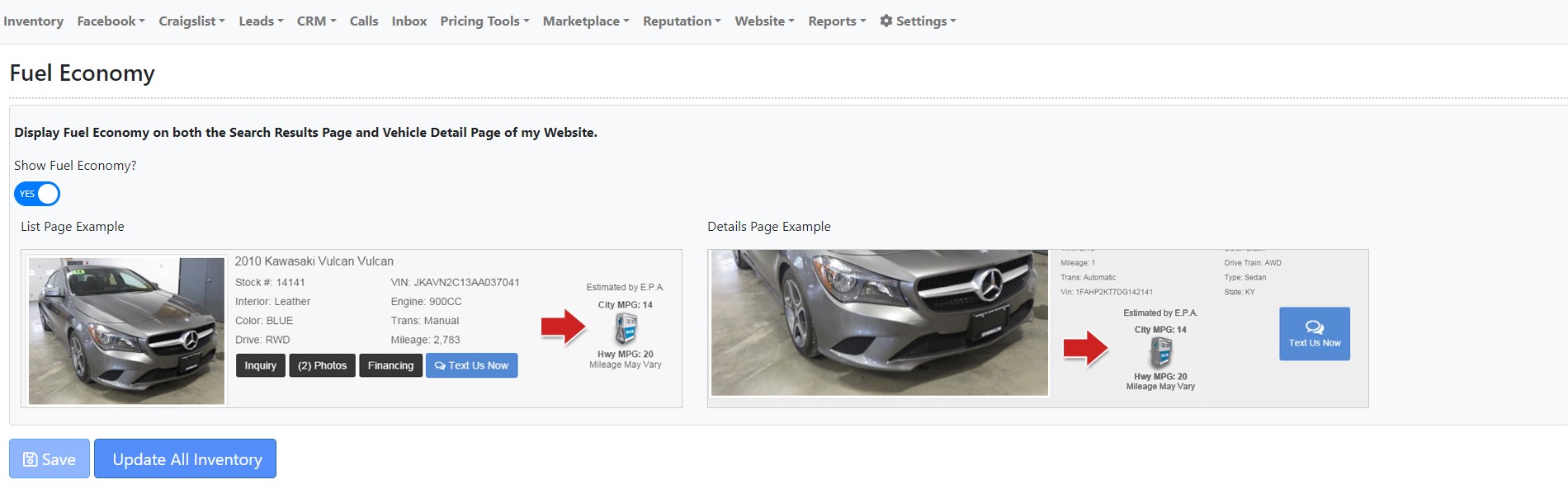 The Fuel Economy page allows you to hide or show the fuel economy for all of your vehicles on both the search results page and the vehicle detail page.