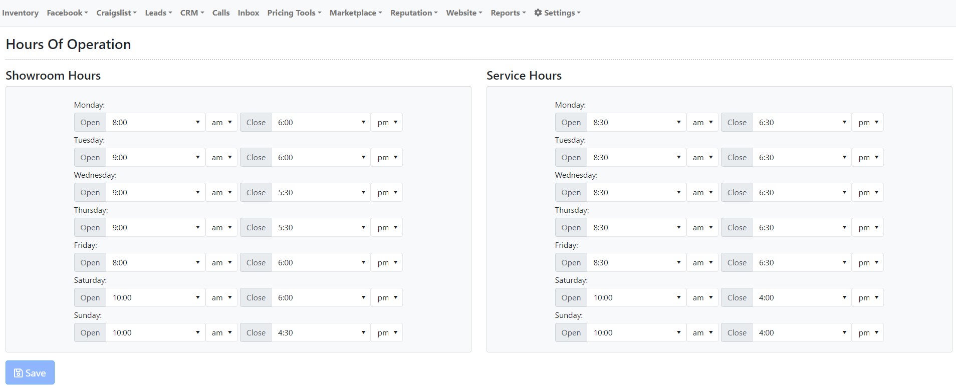 The Hours of Operation page allows you to customize your dealerships business hours which will be directly reflected on the website.