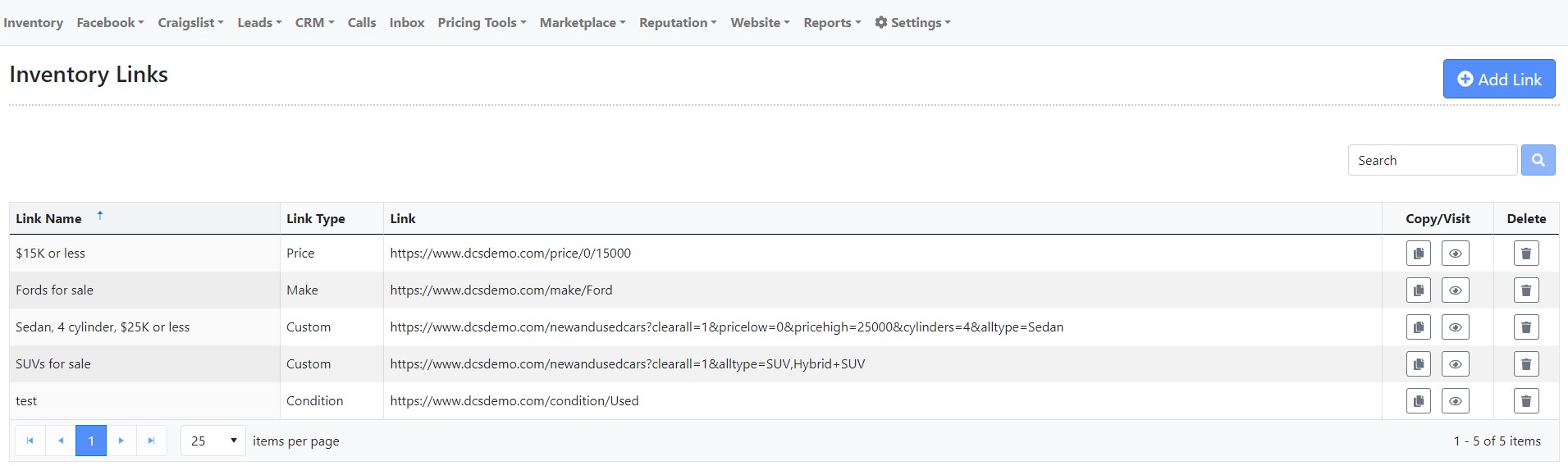 The Inventory Links page allows you to create a link based on specific inventory filters such as price, exterior color, make, or even custom filters which allow you to choose any one of the inventory filters.