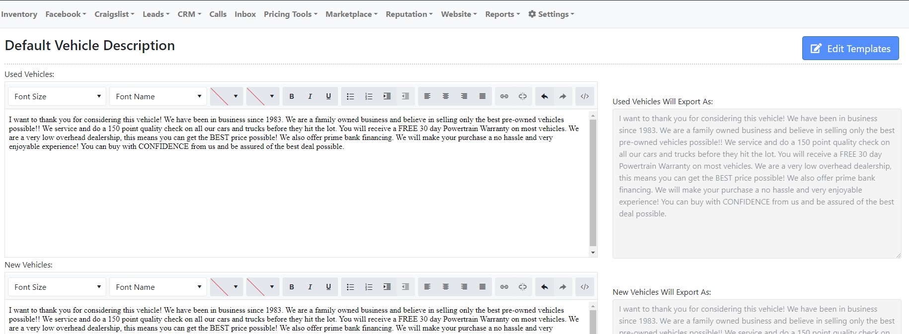 The Default Vehicle Description page allows you to write a general vehicle description that will appear on all of your vehicles by default.